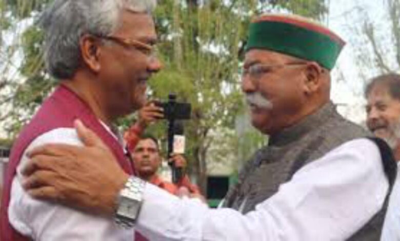 त्रिवेंद्र सिंह रावत और जोत सिंह गुनसोला मतगणना स्थल पर लगे गले